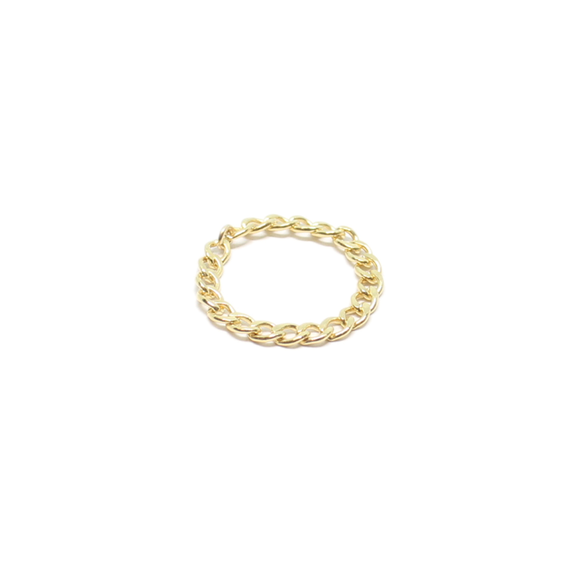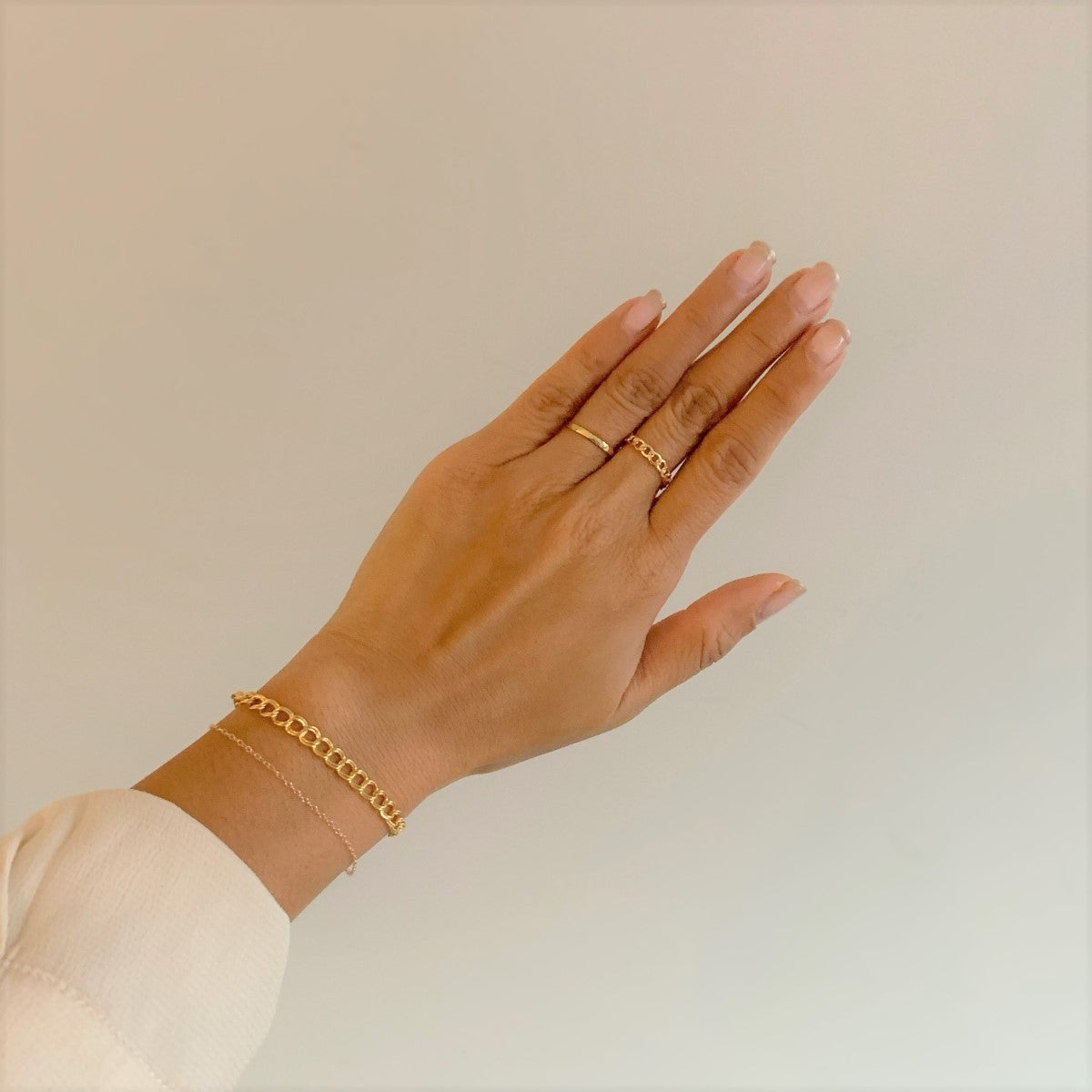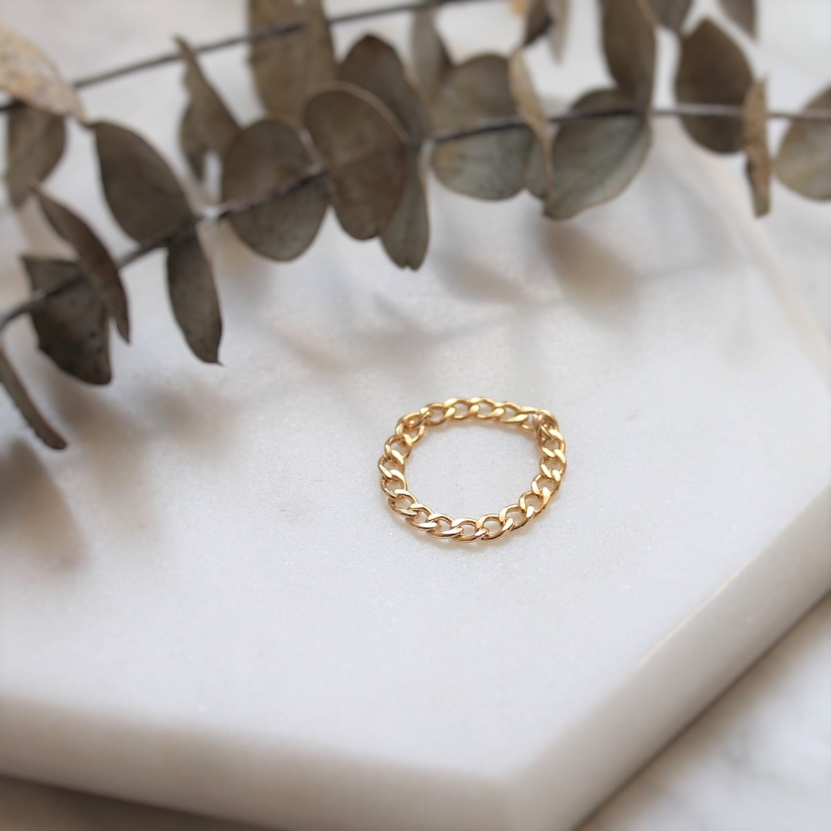 This beautiful ring features a bold curb chain design that is both comfortable and easy to wear. Each ring is created with gold-filled materials and is the perfect piece to add texture and fun to your ring stack!
