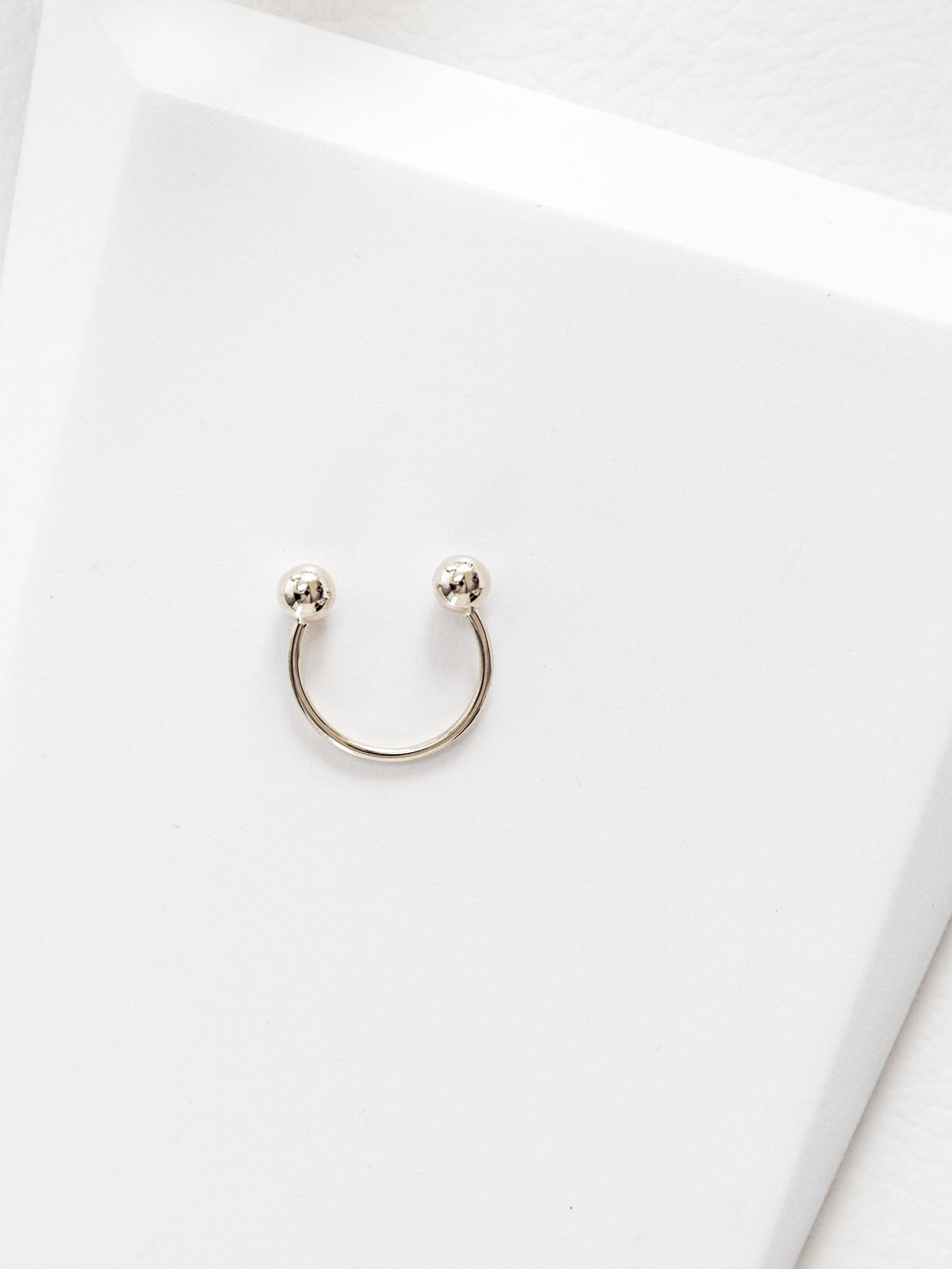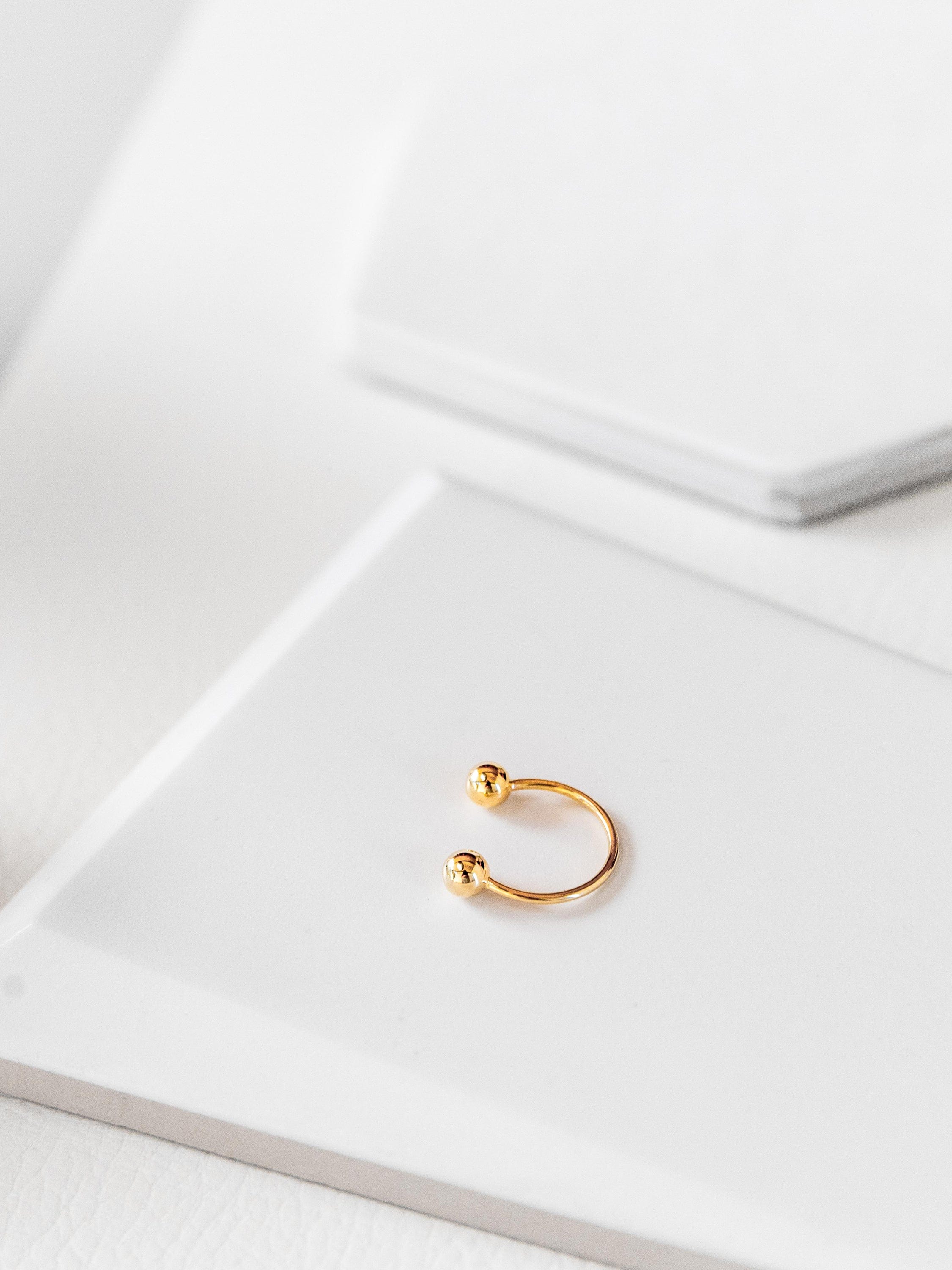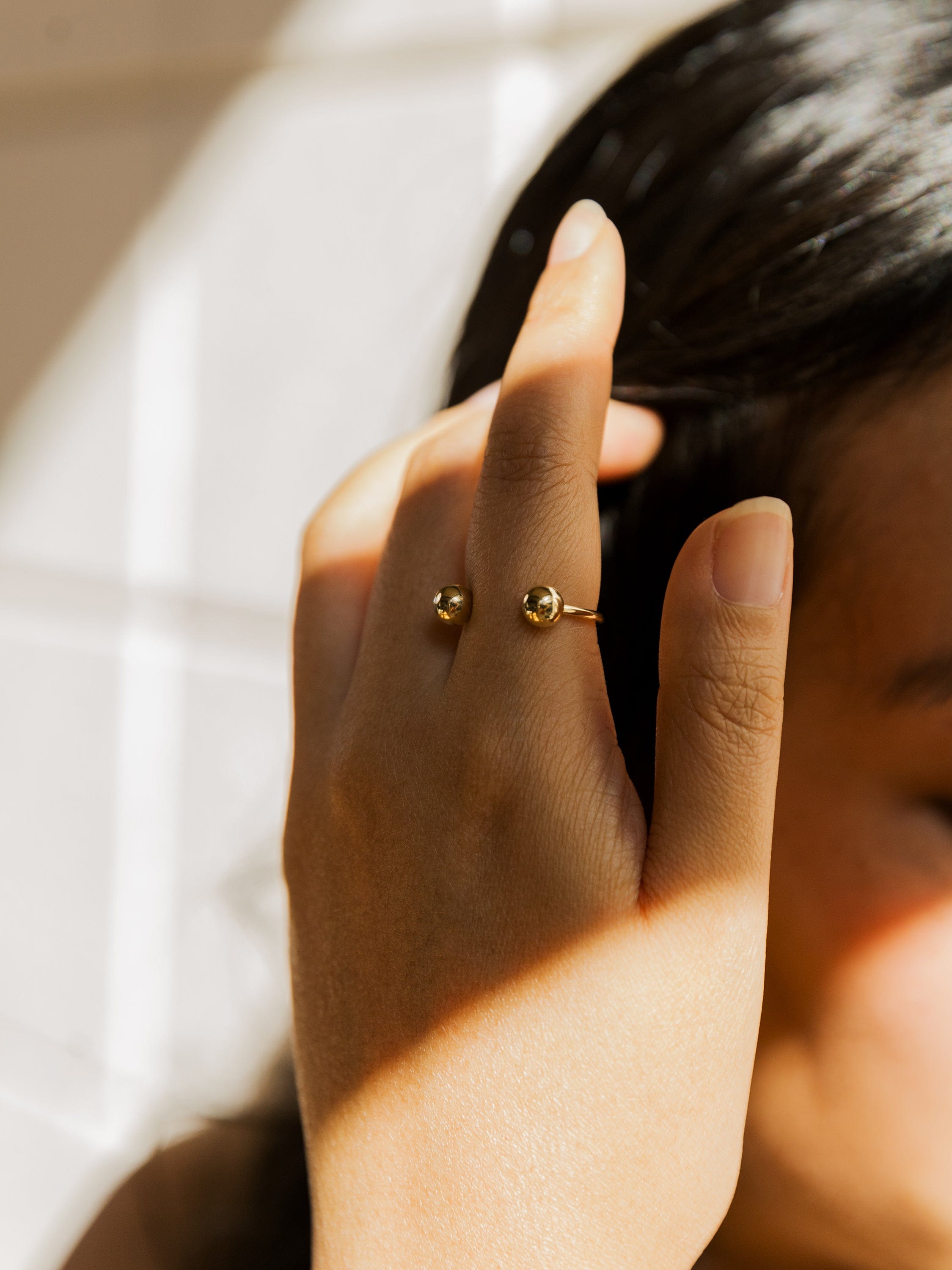 The Dot Duo Ring is a sleek, sculptural piece that creates the illusion of floating spheres between your fingers. Crafted in sterling silver or gold vermeil, it’s the perfect balance of edgy design and understated elegance — ideal for those who love their minimalism with a twist.