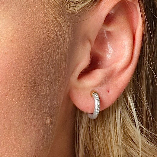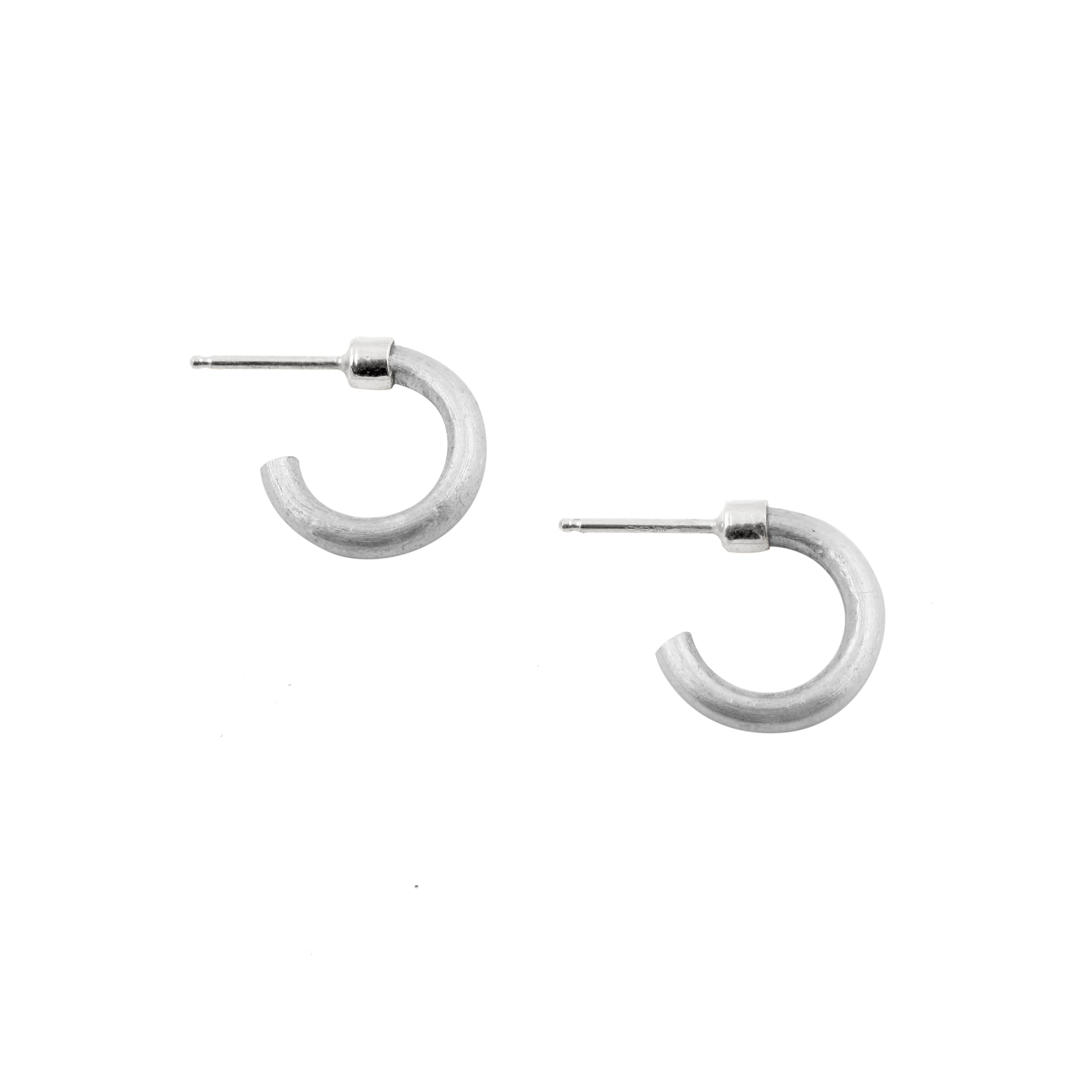 Inspired by our favorite shape: the circle, these lightweight hoop earrings evolved from our virtuous circle shape. Our signature aluminum is finished with either sterling silver bezel, post, and back. We also offer a made to order 14K gold version with five diamonds embedded in each of our signature aluminum hoops.
