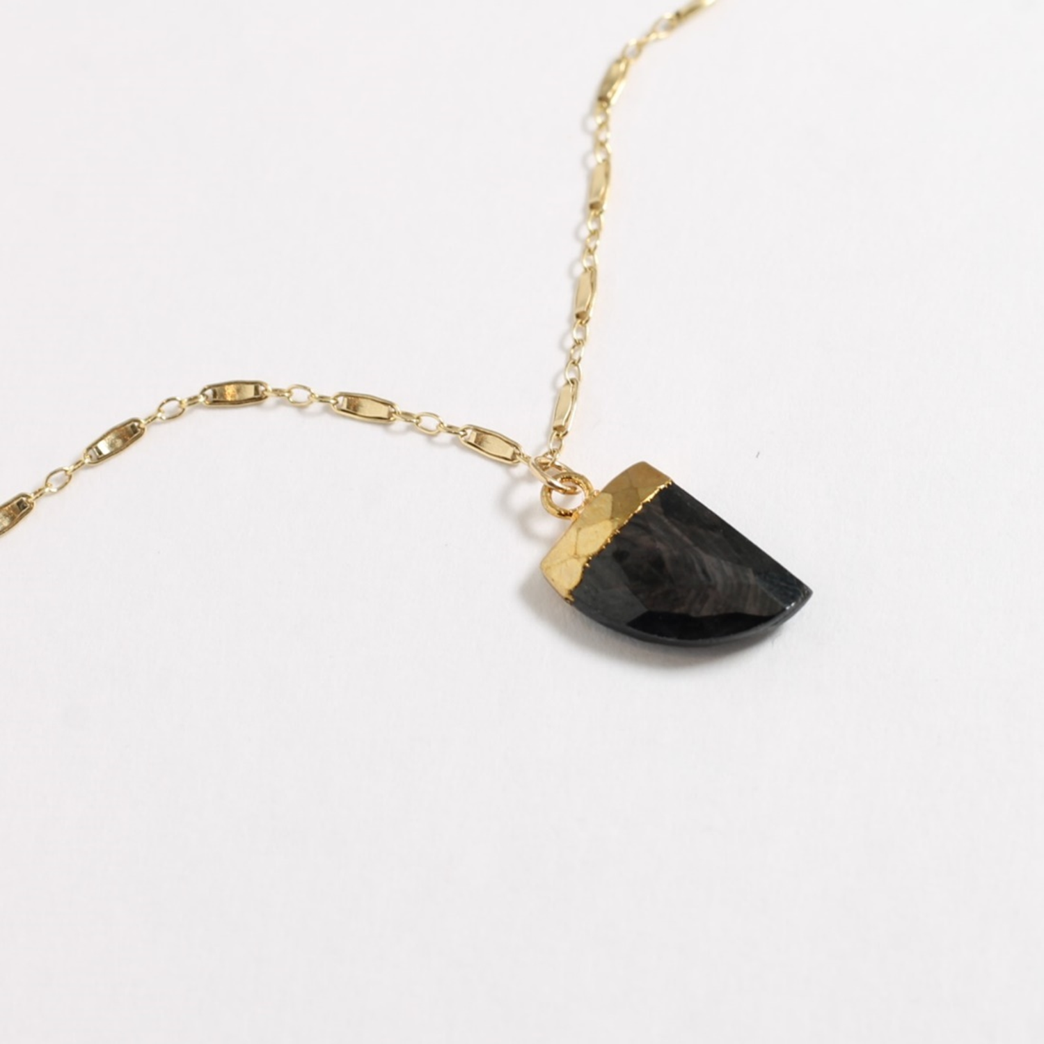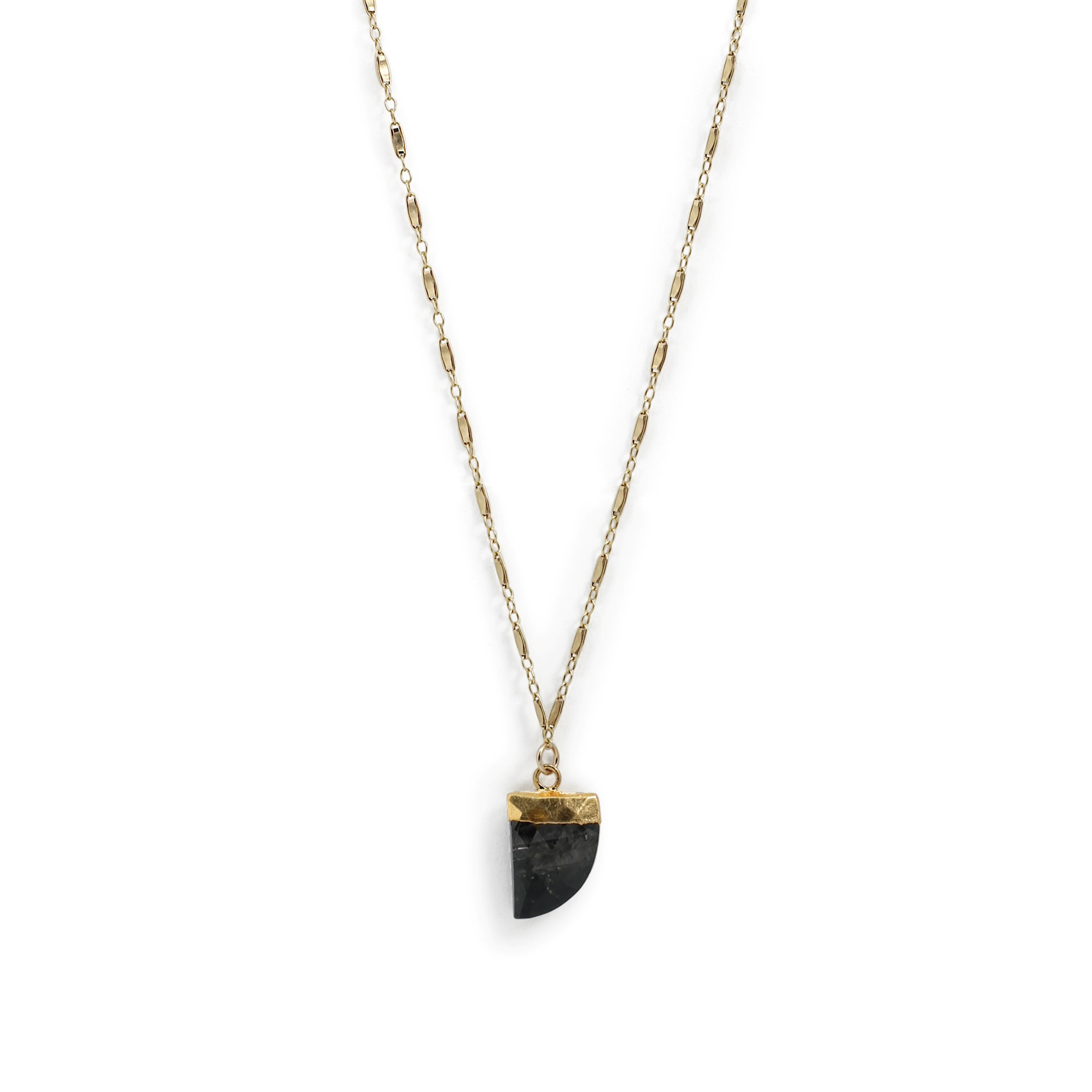 Considered a protective stone, hypersthene helps create calmness and quietness within the mind of the wearer. Faceted in a unique horn shape to magnify the iridescent sheen of the natural stone, this necklace is finished with an intricate bar chain that includes an extender for extra versatility of wear. This stunning gemstone is one you will definitely have to see (and wear!) to truly appreciate!