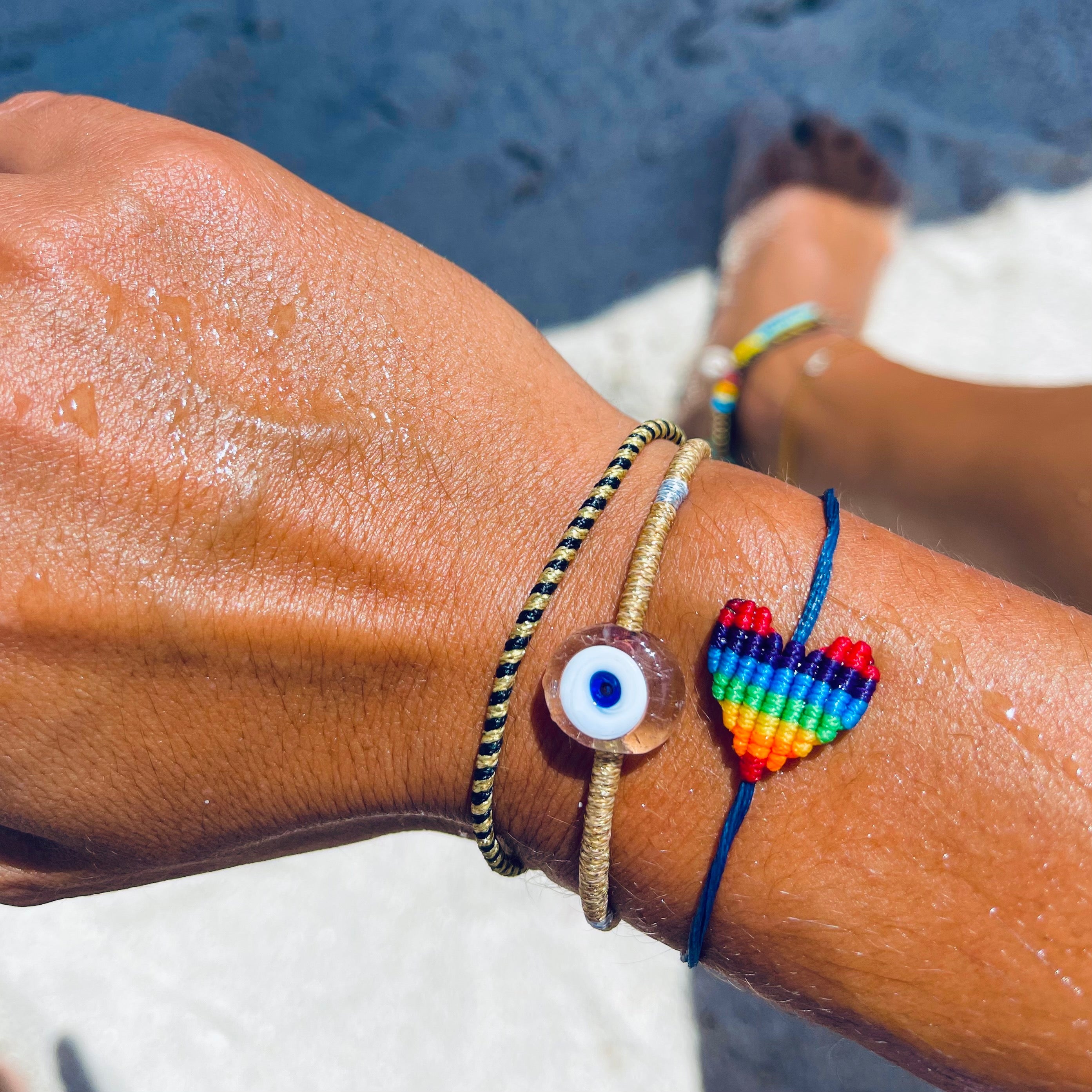 A small transparent murano glass evil eye bead on a golden and silver thread braided bracelet